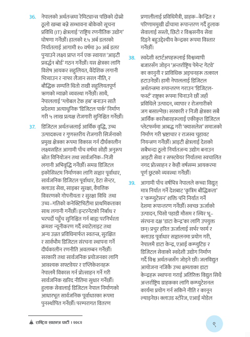 The manifesto aligns closely with Nepal Government’s declaration of 2024–2034 as the “IT Decade”, proposing structural reforms that aim to modernize public services, create employment, and position Nepal as a competitive player in the global digital economy.